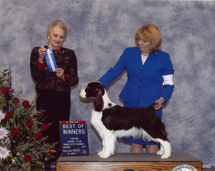 Mum finished her AKC Championship with all points from the Bred By Exhibitor class. She is being shown as a special and finished her Grand Championship in January 2012 at the Rose City Cluster in Portland, OR.